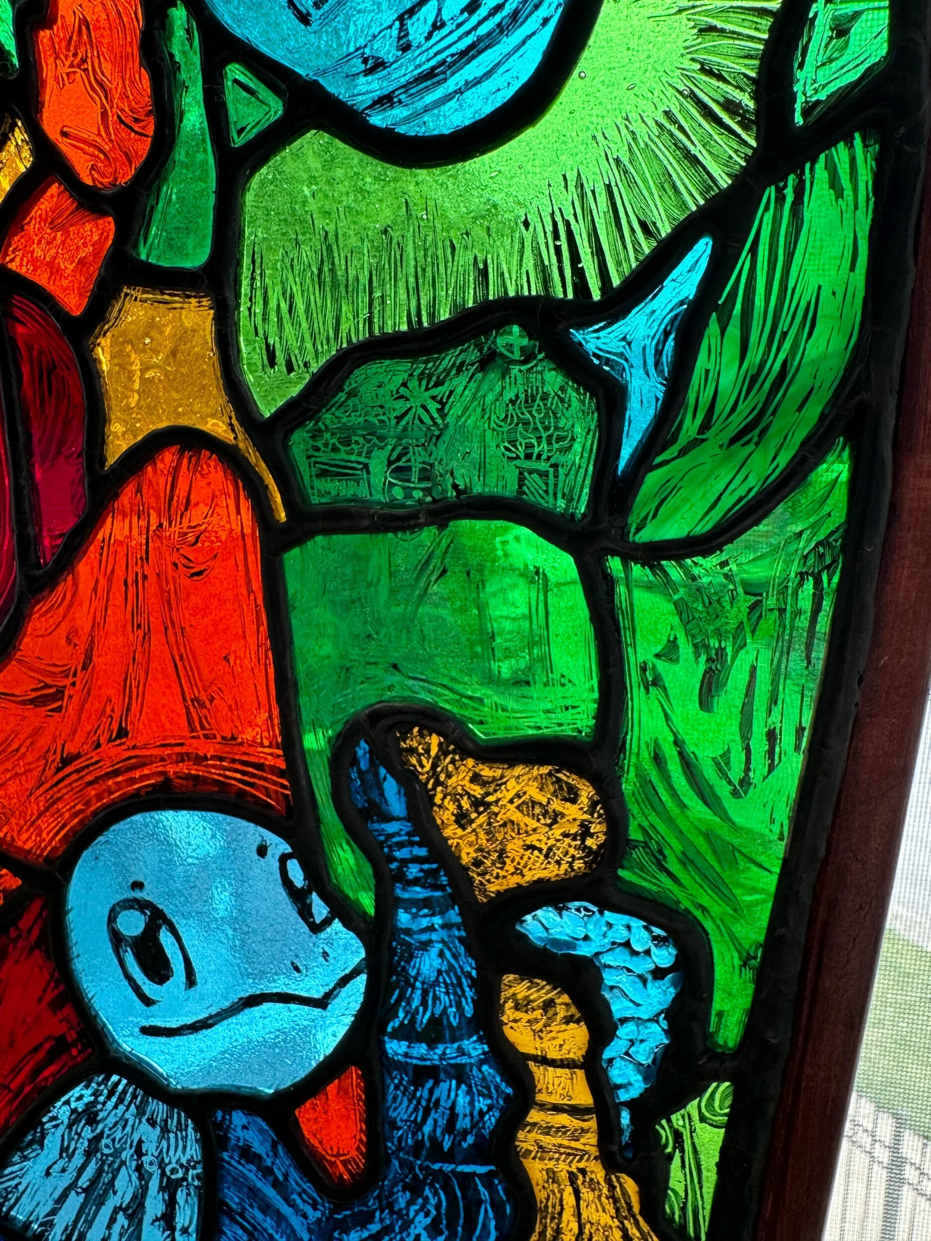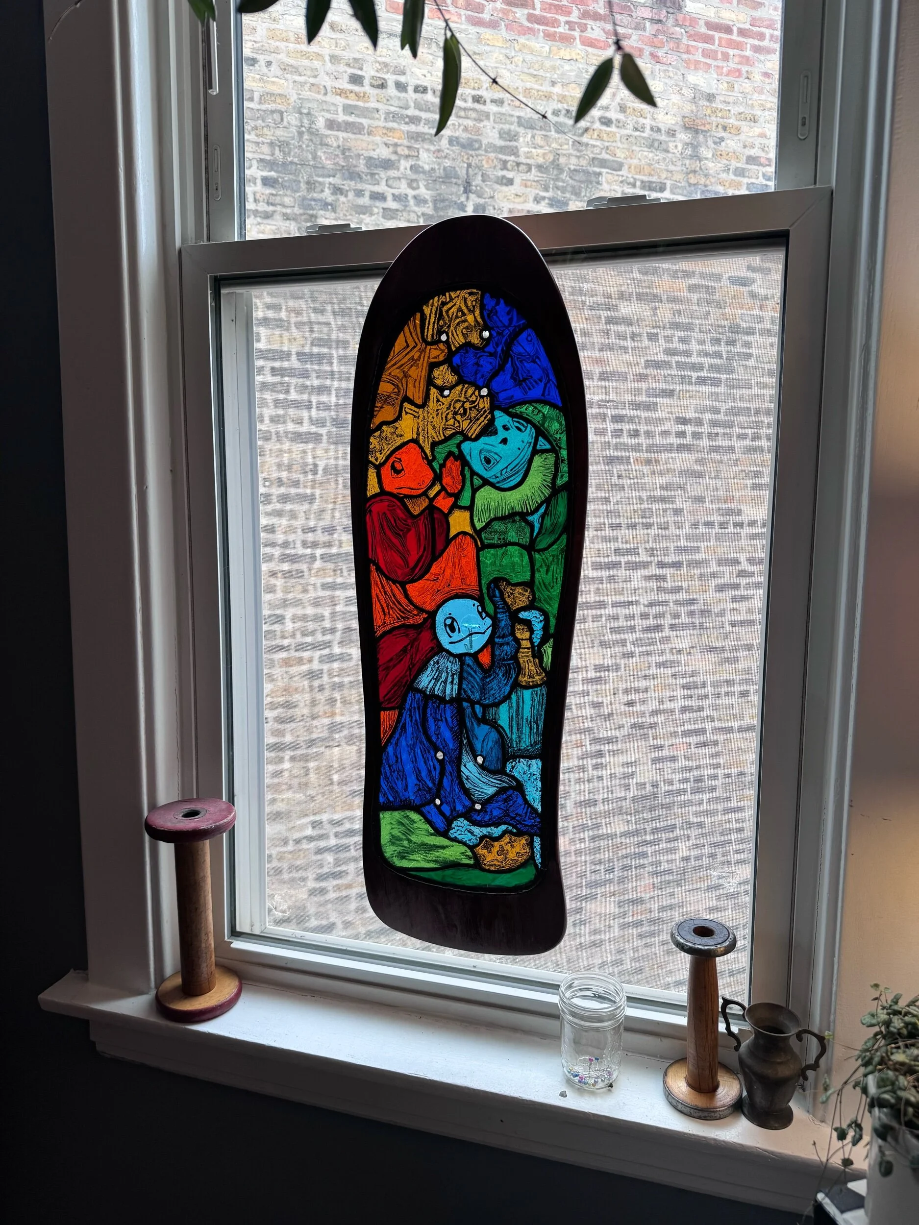 ALL traditional Tiffany-style stained glass with kiln fired Reusche glass paint. Inset and soldered into a maple board and hand stained and varnished.