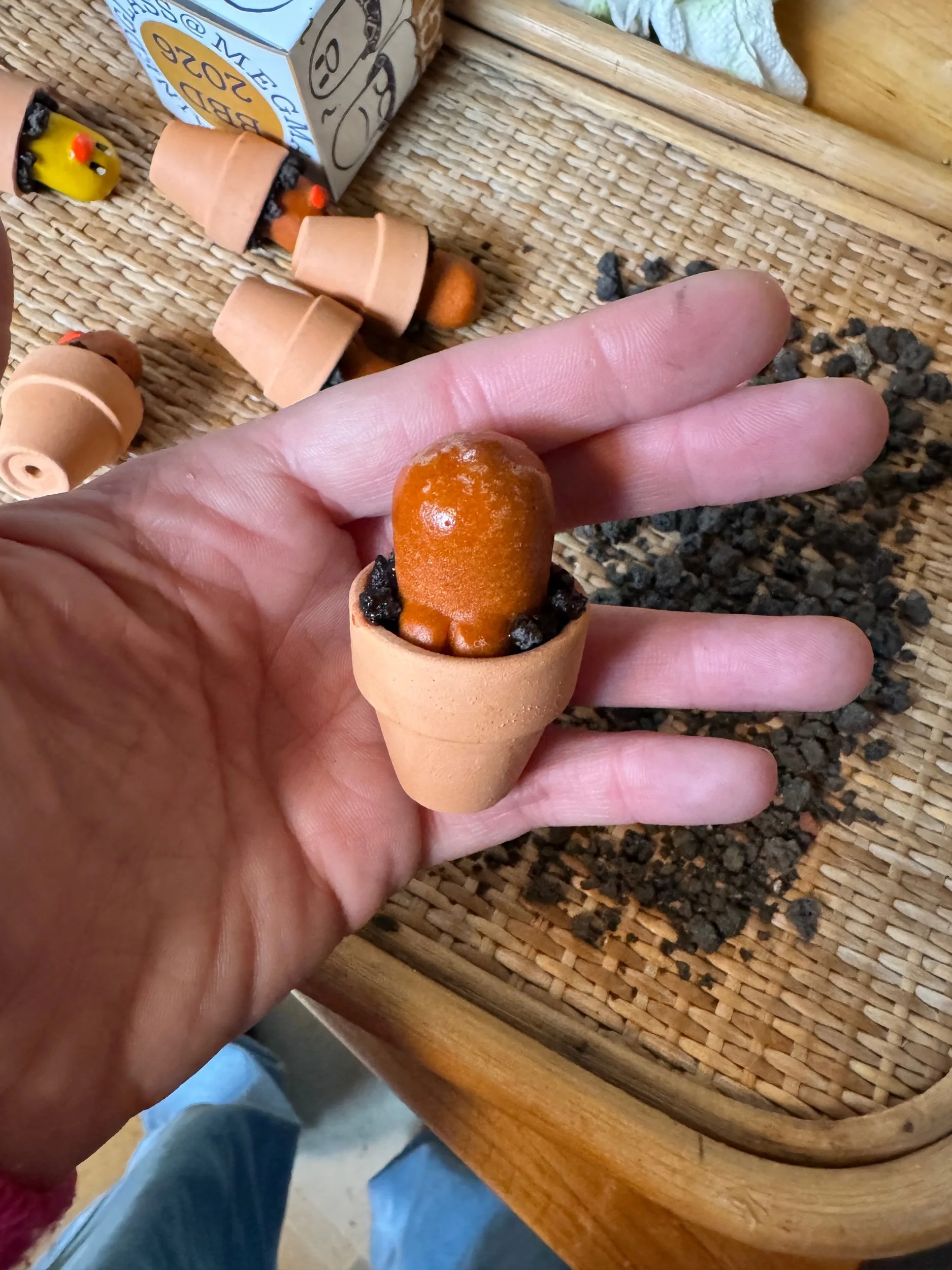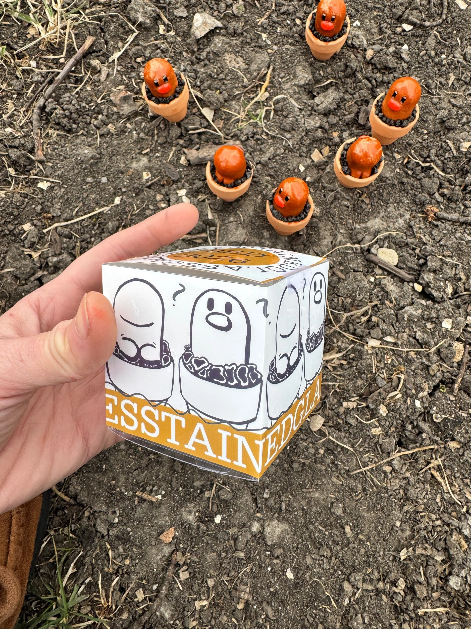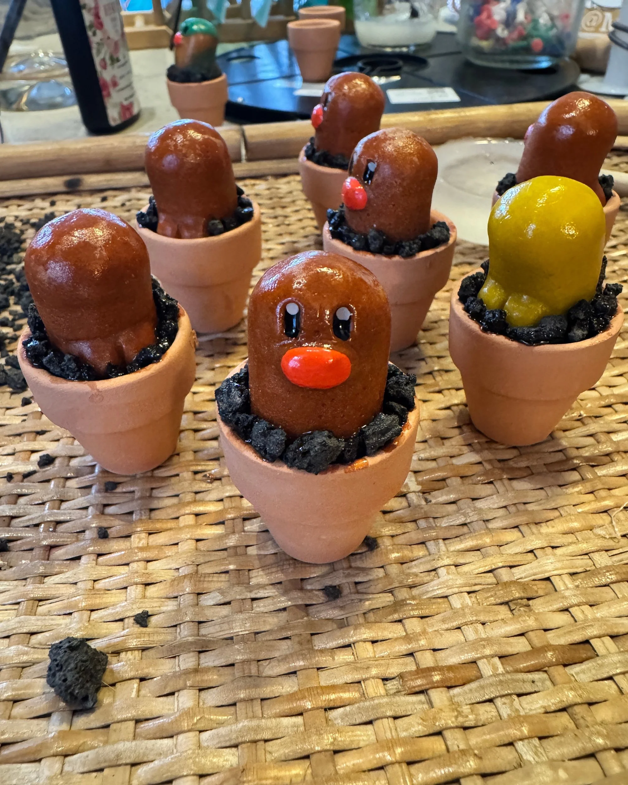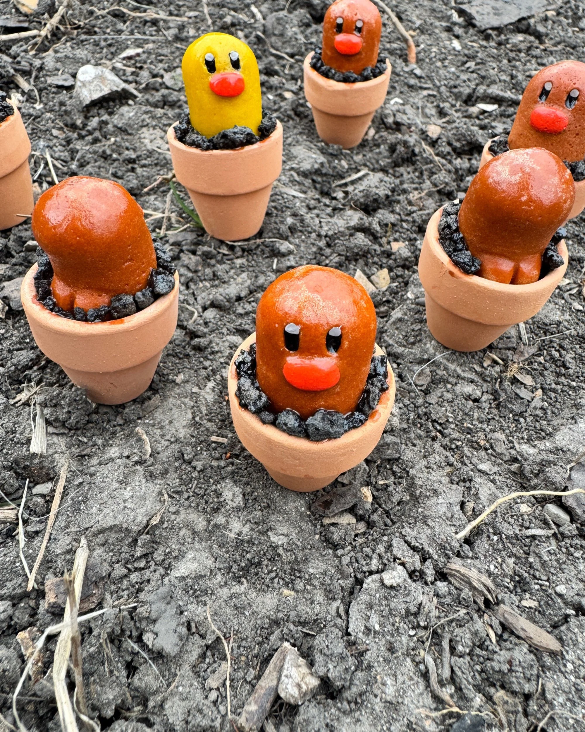 These are super cute. If you follow my instagram stories you got to see the whole process behind these. I pulverized glass scrap and cast it in custom molds I made myself! They are then uv resin’d in place with like some little lava rocks. They are real small, miniatures if you will. one inch pots with the actual glass diglett being about 1.25×1inches